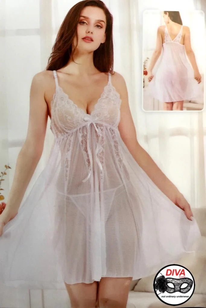Babydoll Sexy trasparente in Tulle e Pizzo elasticizzato Diva by prive’ con coppe in pizzo e spalline regolabili a completo con perizoma in tulle trasparente