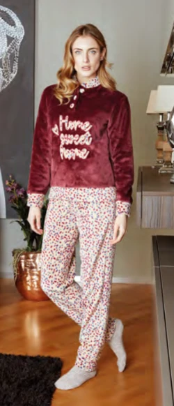 Offerta speciale Pigiama Donna coral pile Nottingham 35696 in tessuto morbido e caldo con maglia aperta a serafino e pantalone fantasia. Ideale da usare come tuta casa massimo confort. Disponibile nelle taglie S/2 M/3 L/4 XL/5 nel colore Boerdeaux ottima qualita’ lunga durata garantita!